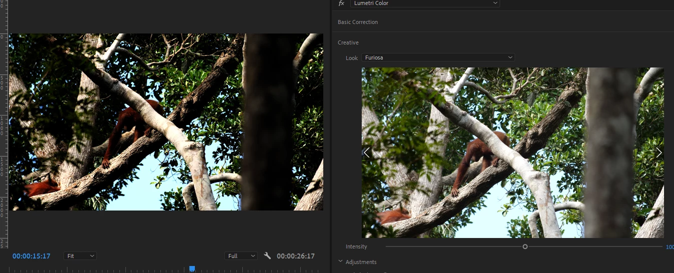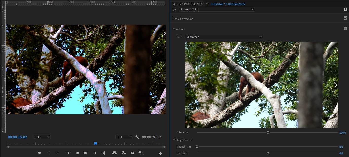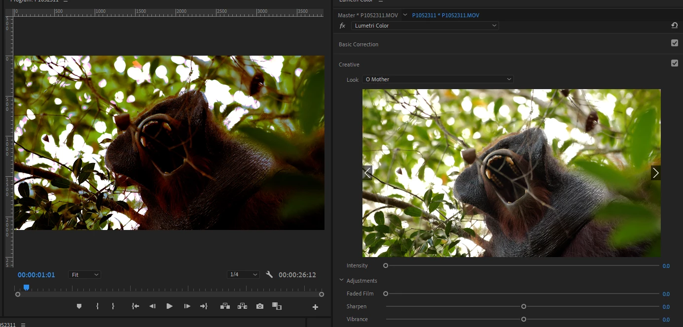 This is without making any other Lumetri adjustments on any of the tabs. The preview is definitely working as I can see it change as I flick through the different looks, and the colours that come out in the program monitor (as you can see in the 2nd example below) definitely don't look right.