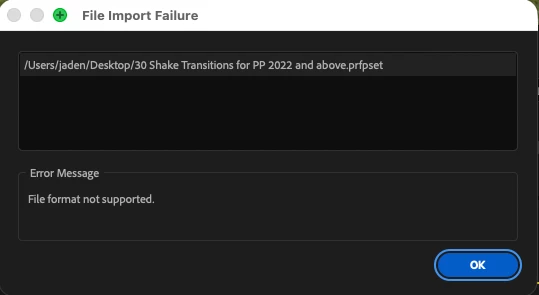 When I hit import preset, the file doesn’t even show up in finder. When i drag it into premeire pro it says the file is not supported but its the exact file type that they need. Im on 2026, latest version. can someone help?