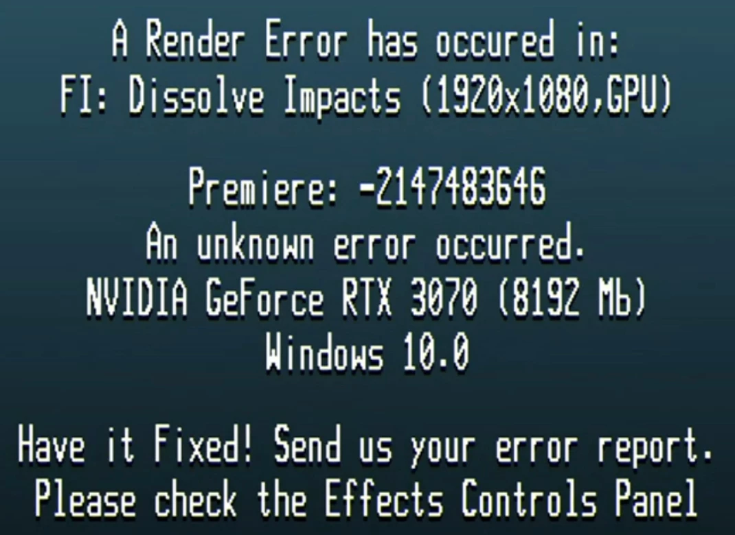 송송현5E1EParticipantForum|Forum|2 years agoApril 18, 2023QuestionWhy do you have the current symptoms?Forum|Forum|2 years agoApril 18, 20230 replies188 viewsAfter exporting the file, the video was played and the imported screen showed a message like a picture. Why do you have these symptoms when you use film impact? Your Premier Pro version is version 22.0EditingPerformanceExportHardware or GPUError or problemCrashEffects and Titles