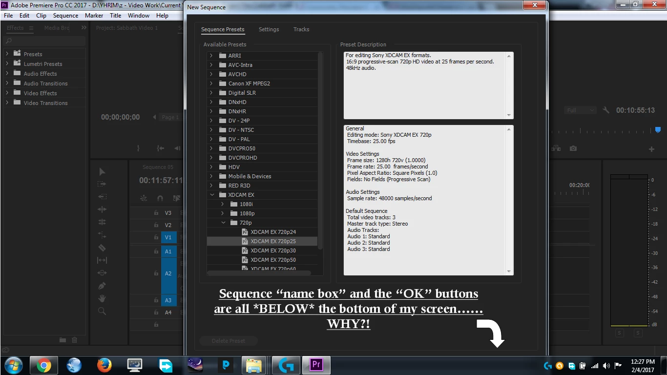 WIth it doing this, In this specific example, as you can see from my screenshot, I can not see the "Sequence Name" box where you can rename the Sequence. Nor can I see or click on the "OK" or "Cancel" buttons. Up to this point in time, since I can't click the "OK" button, the only way I can make a new sequence is to just hit "enter" on the keyboard. This is REALLY Annoying to say the least. And it hasn't just been happening on the "New Sequence" windows either.