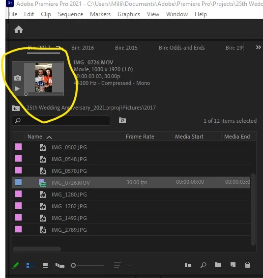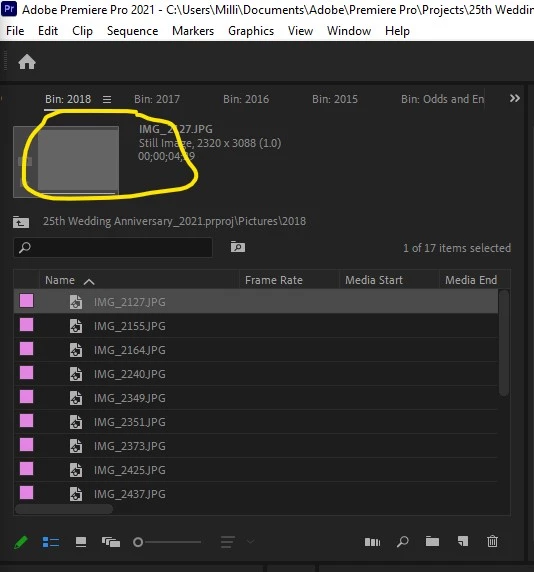 So something that is quite annoying while working on a large project.  I import all my pictures and videos and to determine which picture I want to add to the timeline normally I would click on the file in the bin view and it would show a small version of the photo.  Now, for whatever reason, it only shows a grayed out box.  Meaning if I want to see what the photo looks like (without changing the view style at the bottom of the bin, I have to double click it and open it in the Source monitor.  This is very lame and greatly slows down my video editing.  So what happened in the latest upgrade that would mess with this???  It seems to work with some jpgs and not others.  Oh and BTW it works flawlessly when you click on a mp4 or mov file.
