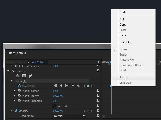 2. Immediately under the "Opacity" effect name, you'll see an elliptical mask, rectangular mask, and freeform (pen tool) mask.