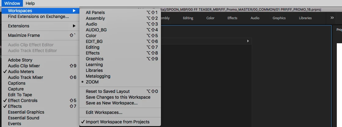 I have created and saved a number of different workspaces, based on the defaults. So instead of Edit, I've created Edit2. Instead of Color, I've created Color2, and so on.