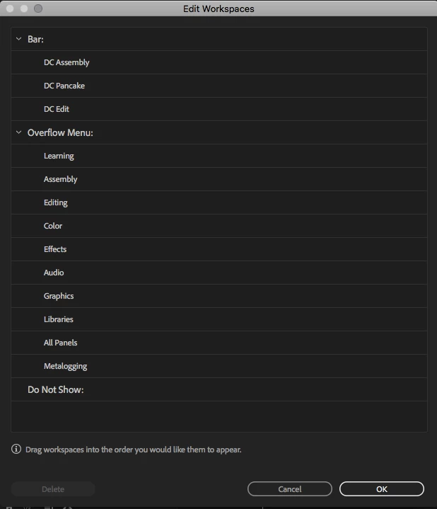 However, when I shut down Premiere and reopen it, the Workspaces Panel reverts to the original, default layout.