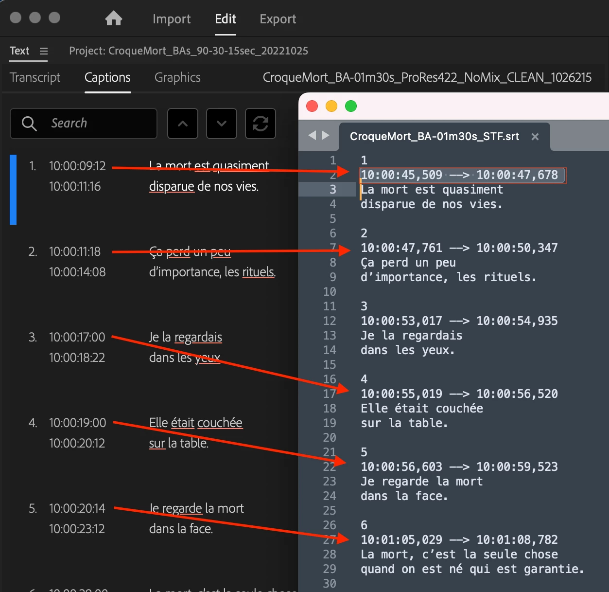 Img. Left (Premiere Pro sequence). Right (exported SRT file)