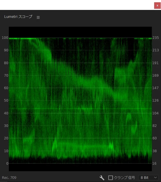 撮影時の波形では間違いなく100IRE以上の情報まで撮影されているにもかかわらず、Premiereに読み込むと100IRE以上の輝度情報がクリップされてしまいます。