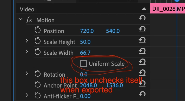 When I export my timeline into an XML, upon reopening it, I notice that my clips are all stretched. The "uniform scale" box under Effect Controls for all the clips has been unchecked, even though I had definitely checked it prior to the export. I'm unsure as to why this happens and I'm seeking a way to preserve the "uniform scale" setting when I export my project as an XML.
