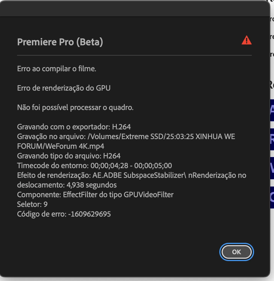 Editando no Premiere Pro Beta, quando aplico a transição "cross dissolve" em algumas partes do video o sistema acusa um erro e não consegue continuar a exportar.