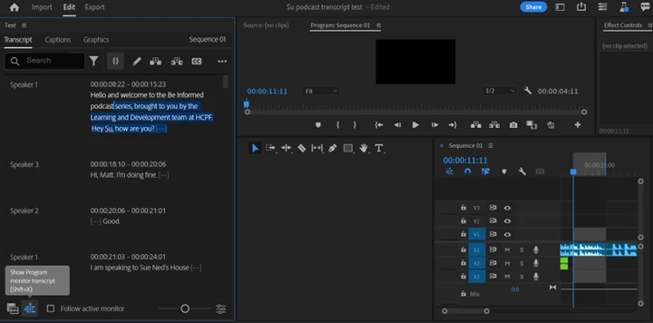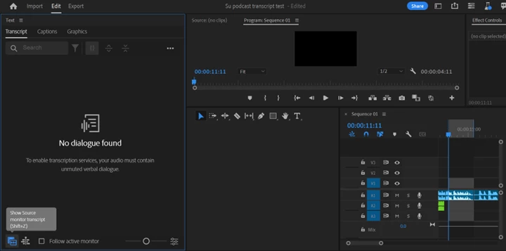 There's a button, or Shift + Z option for the source and when I go there it says "No Dialog Found - to enable transcript services, your audio must contain unmuted verbal dialog". Nothing is muted and it ovbiously heard something because I can see the transcribed conversation and speskers.