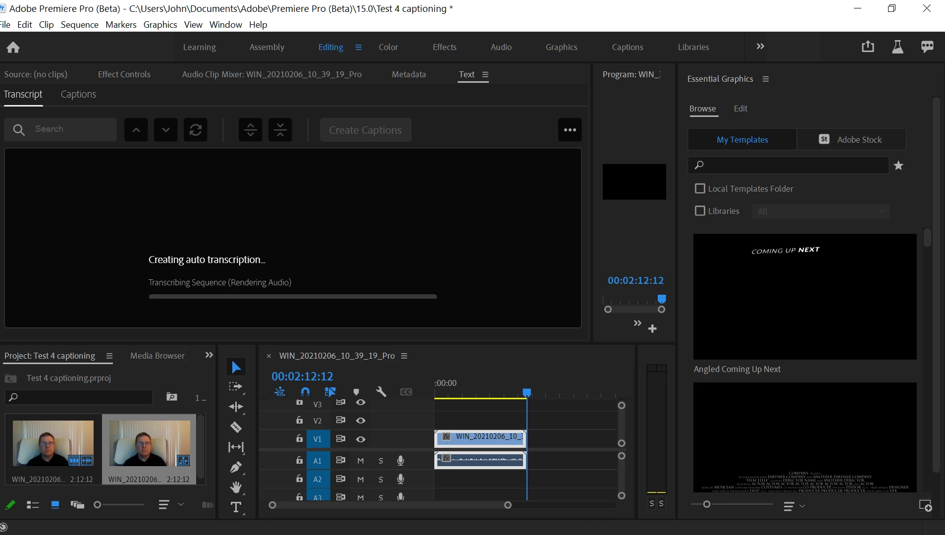 First attempt to use beta Text feature for transcription/captions was easy and successful. All four subsequent attempts using new footage hangs system while in "Creating auto transcription" mode.
