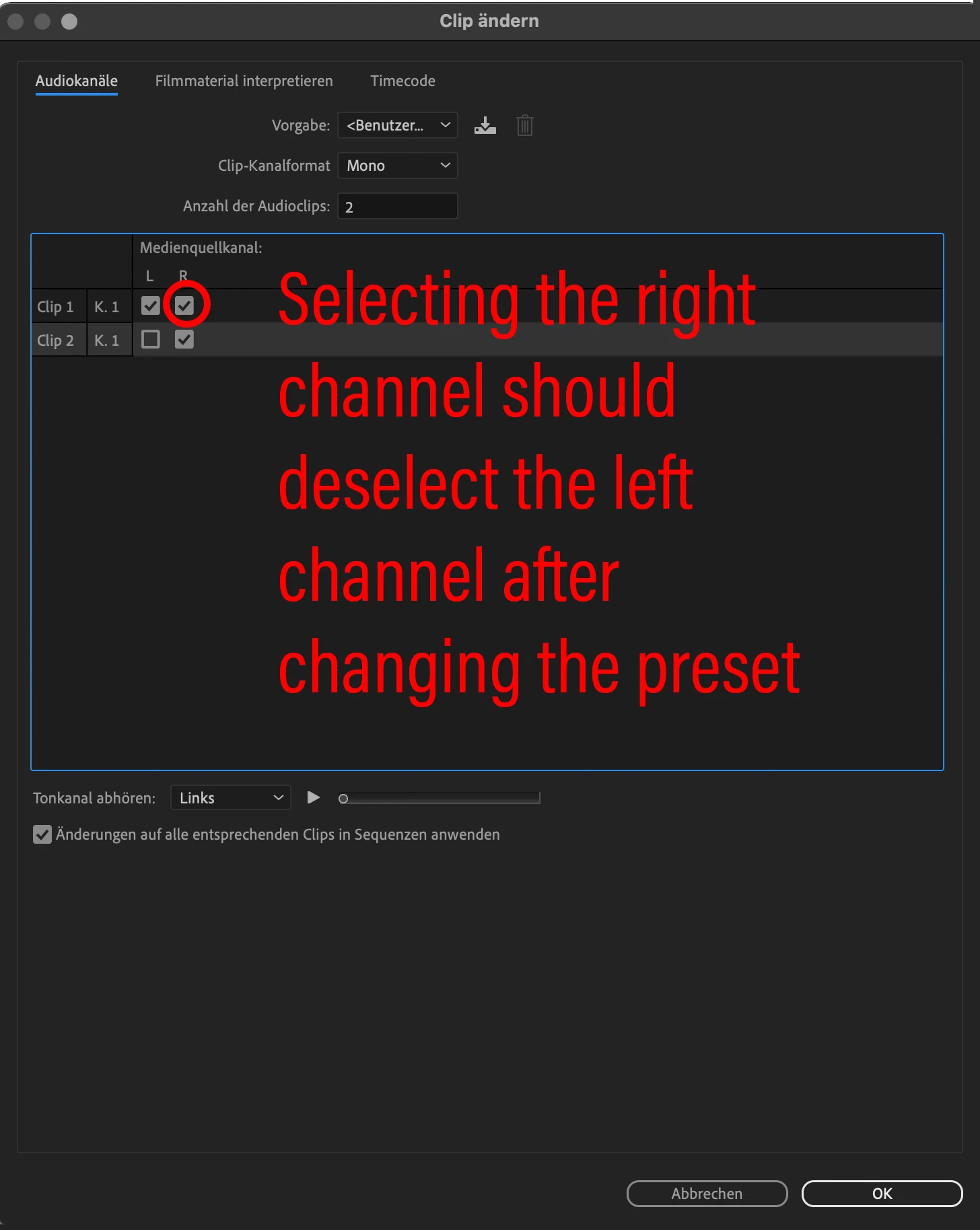 3. Check the right channel for Clip 1. This should deactivate the left channel automatically but the checkbox remains visible.