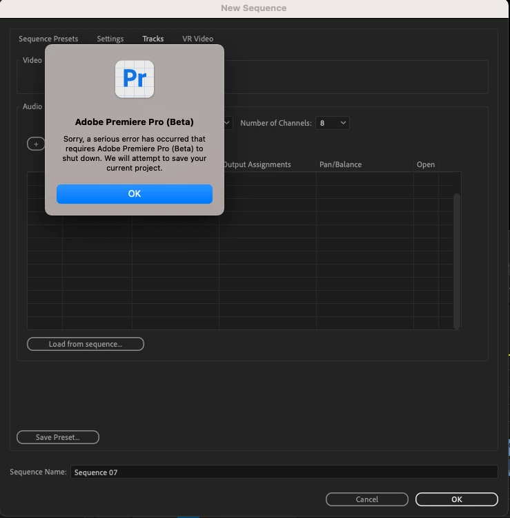 Premiere Pro crashes when I try to modify Tracks from New Sequence...