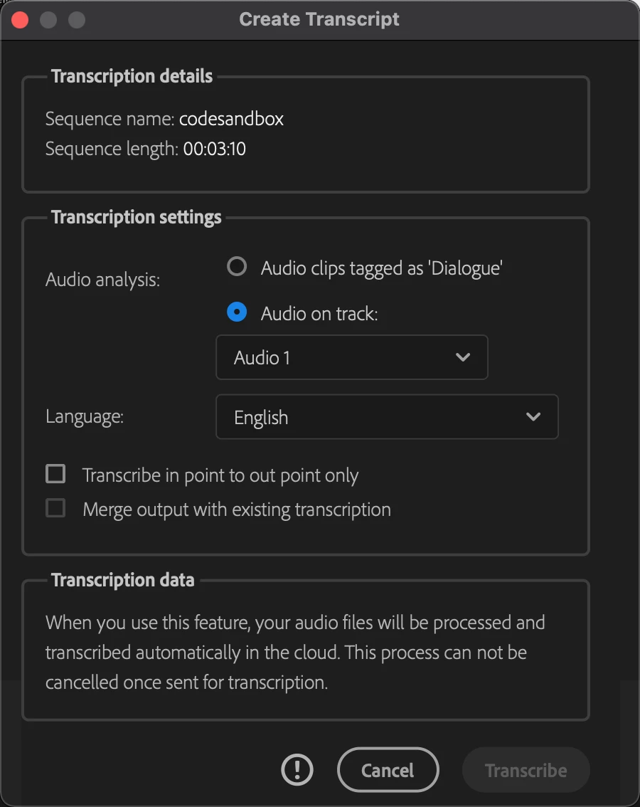 I'm trying to create a transcript in Premiere Pro and even though I'm authenticated to CC, the dialogue box says it can't connect (see the information icon). Here's a screenshot: