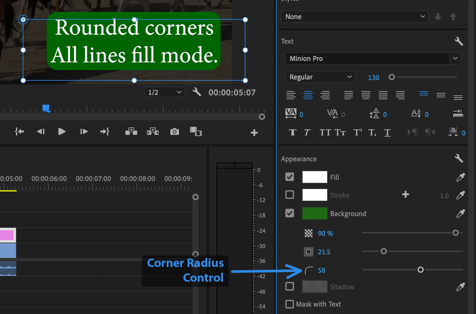 We're happy to offer early access to some new Background improvements for Captions and Essential Graphics in PrPro 15.3 Beta. Specifically, you can now put Rounded Corners on your text background and also set it to have a Per-Line fill instead of All Lines. We are looking forward to your feedback!