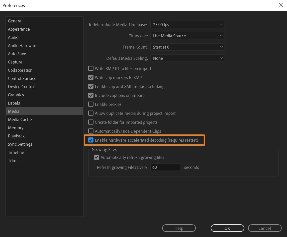 Restart of Adobe Premiere Pro is required in case preference is changed.