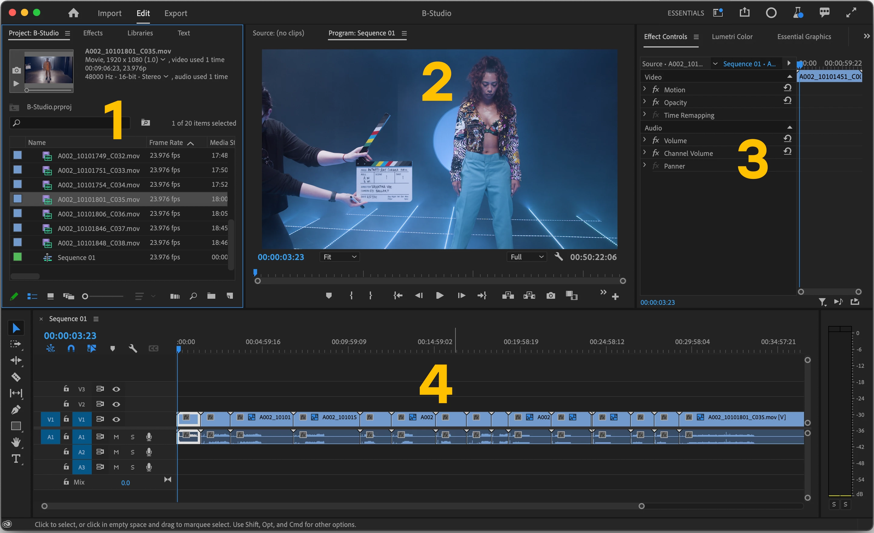 - Effects controls, Lumetri Color, Essential Graphics, Essential Audio, Metadata. All the panels needed for core workflows are docked in the same panel. This reduces the need to switch workspaces when moving through the different stages of work (color, audio, graphics, etc.) You can think of this area as the place you adjust properties.