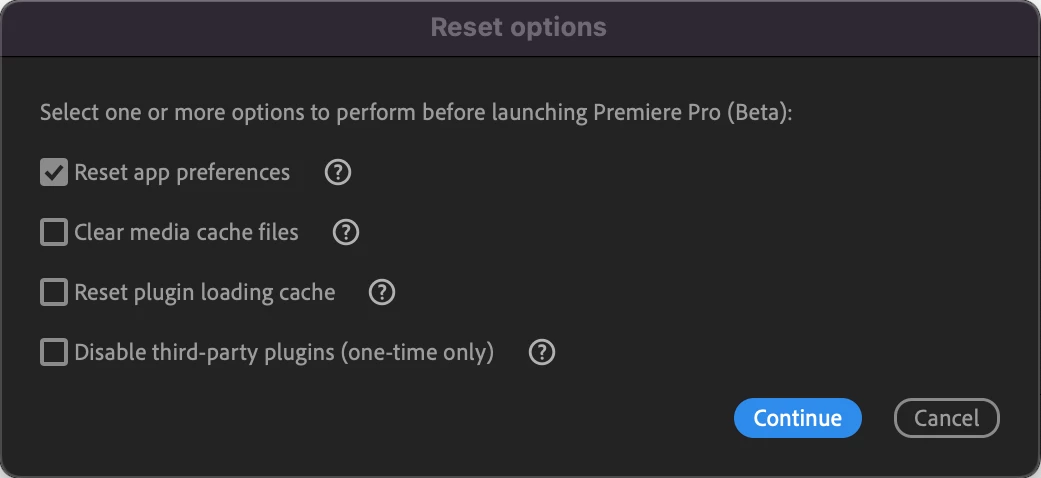 The corresponding key used to bring up the dialog will auto-select that setting in the dialog (e.g. using ‘Option/Alt’ to bring up the dialog will auto-select the ‘Reset app preferences’ checkbox. You can also combine keys that will result in multiple options selected (e.g., ‘Shift + Option/Alt’ will result in auto-selecting ‘Reset app preferences’ and ‘Reset plugin loading cache’). Once the dialog is up, you are free to make any selection you like.