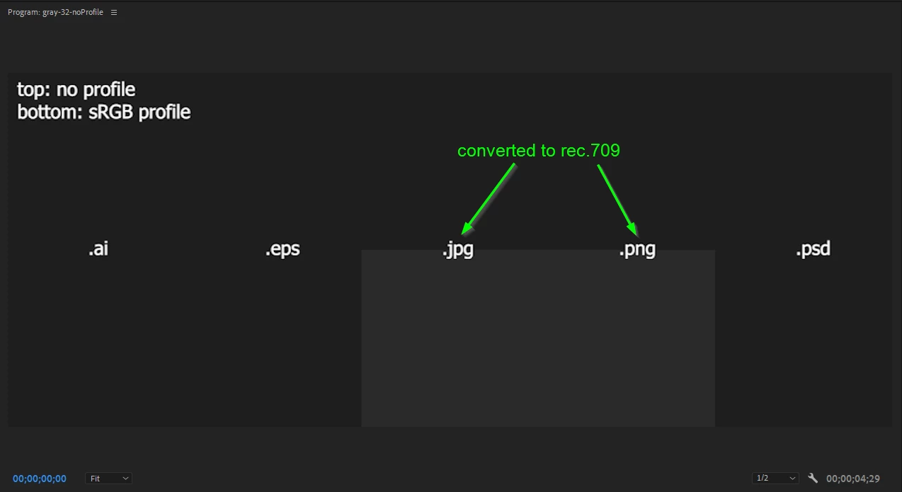 That includes you sRGB! I mean look at this. We don't have control over it. This is a 5x2 grid of identical color squares with same filetype vertically. The top row has no profile embedded and sRGB embedded bottom row. Only .jpg and .png get detected and auto converted whilst AE detects .psd .ai and I think .eps too.