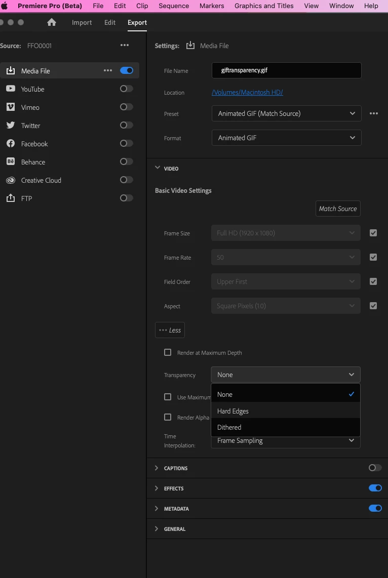 With the latest Adobe Premiere Pro (Beta) and Media Encoder (Beta) builds we have enabled the support for exporting GIFs with transparency. What does this mean for you? You now have 3 transparency options to choose from: