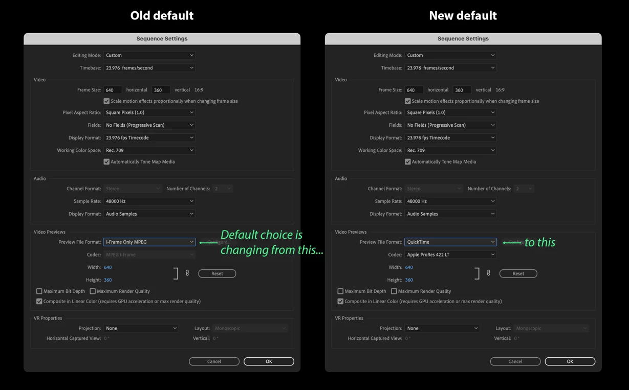 In Premiere 23.0 we’re changing the default preview codec for most new sequences created from media to Apple ProRes 422 LT. The previous default was I-Frame Only MPEG.
