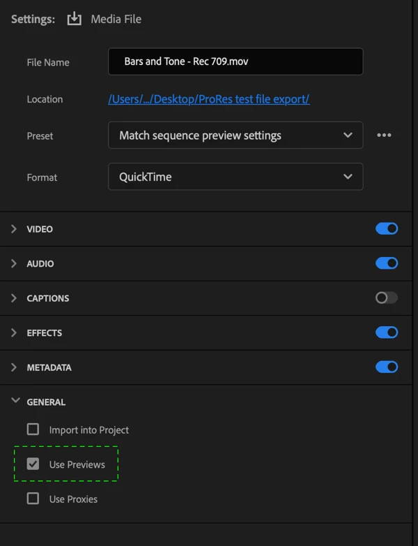 Choosing “Match sequence preview settings” will also enable the “Use Previews” checkbox under General settings. This tells Premiere to export using your already rendered preview files, which can shorten export times even further: