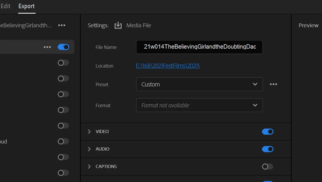 However an annoying thing happened. I presumed it would work like in the past where succeeding exports would take on the previous setting. With exporting from separate sequences, it defaults to "MPEG Preview," and in AME, you can't change it. I'm having to re-export each of the 25 or so clips I have to export, changing the preset each time.