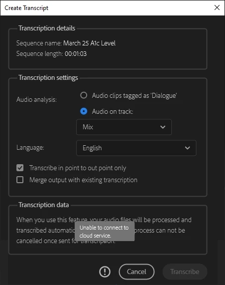 howdy, I've been part of the beta transcription/captions program.  and, today, when I go to transcribe a sequence...it indicates that it "unable to connect to cloud service."