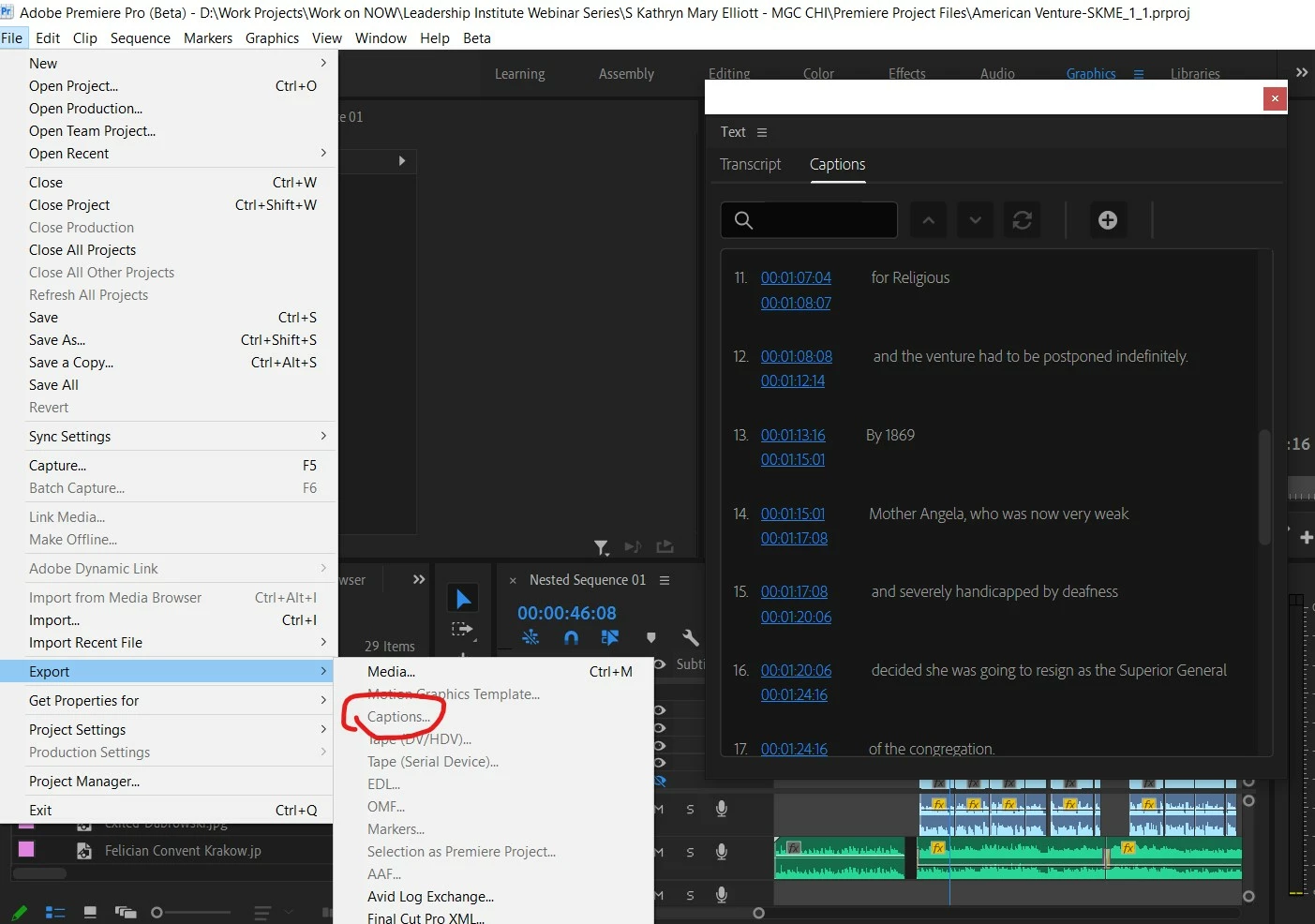 I create close captions using the new feature. When I go to export option in the File menu. caption is disabled cannot select. please help. I have attached a screenshot.