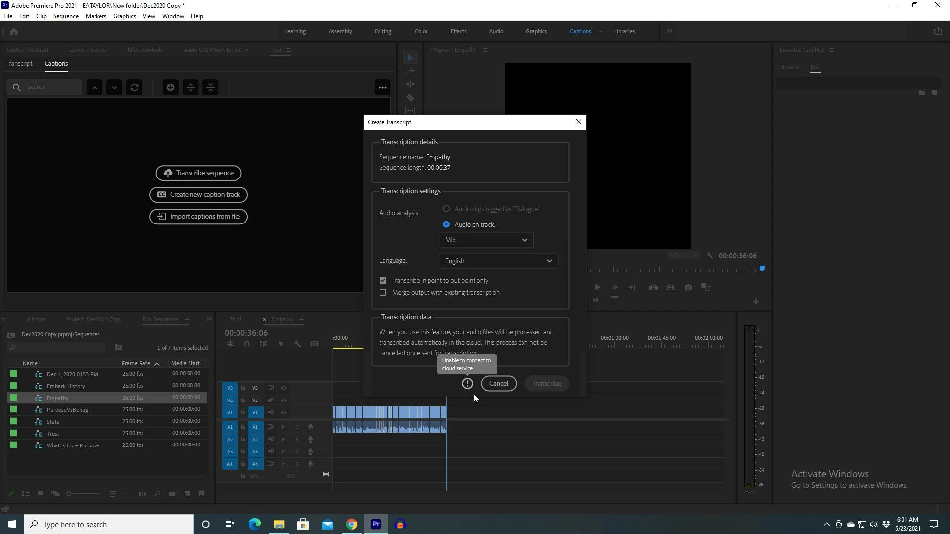 when i am tring to transcribe the sequence, it say "UNABLE TO CONNECT TO CLOUD SERVICE"