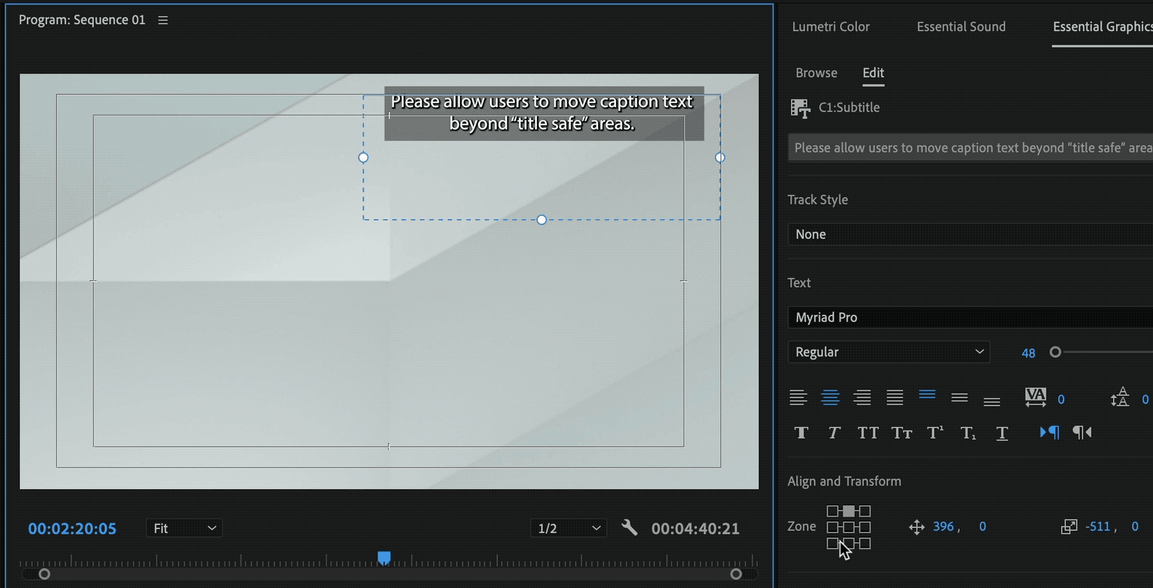 There are many special non-broadcast special use cases where precise positioning of stylized captions are necessary. But Premiere's caption positioning doesn't even allow placement beyond any of the title safe margins.