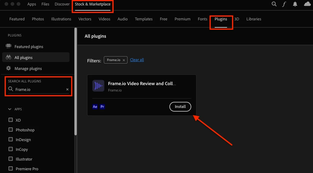 You can also install the Frame.io extension from the Creative Cloud Desktop app. Go to your CC app, choose Stock & Marketplace, then choose Plugins. In the search box type in Frame.io. You should now see a Install button.