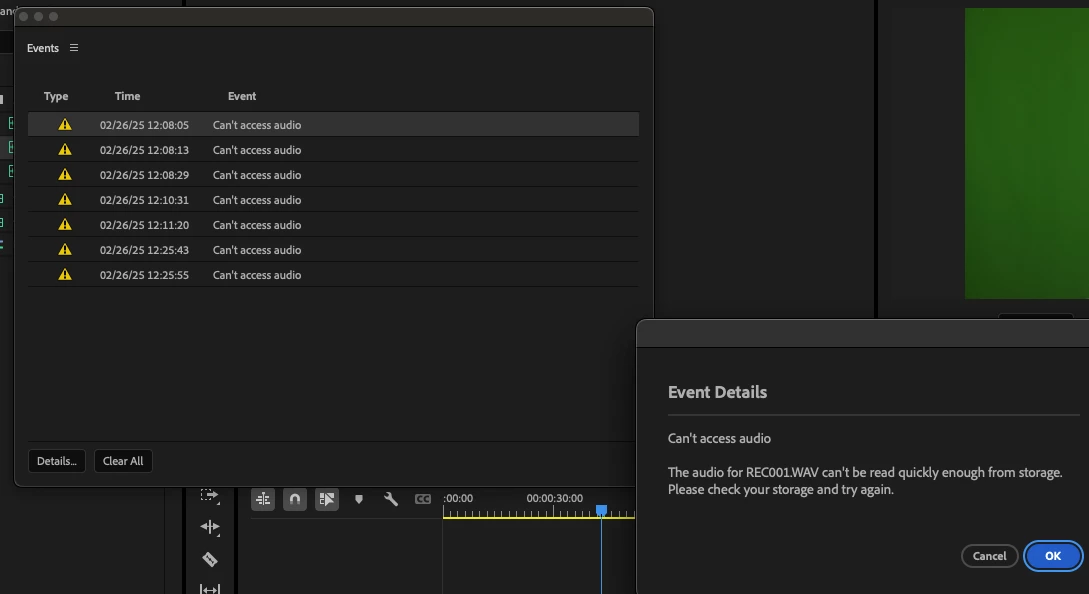 i'm working on a video montage in premiere, but for a few days now the audio has been crashing, continuing to show me the error ‘can't access audio: the audio can't be read quickly enough from storage. please check your storage and try again.’