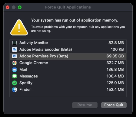 Premiere Pro Maxing Out RAM Then Asking to Force Quit