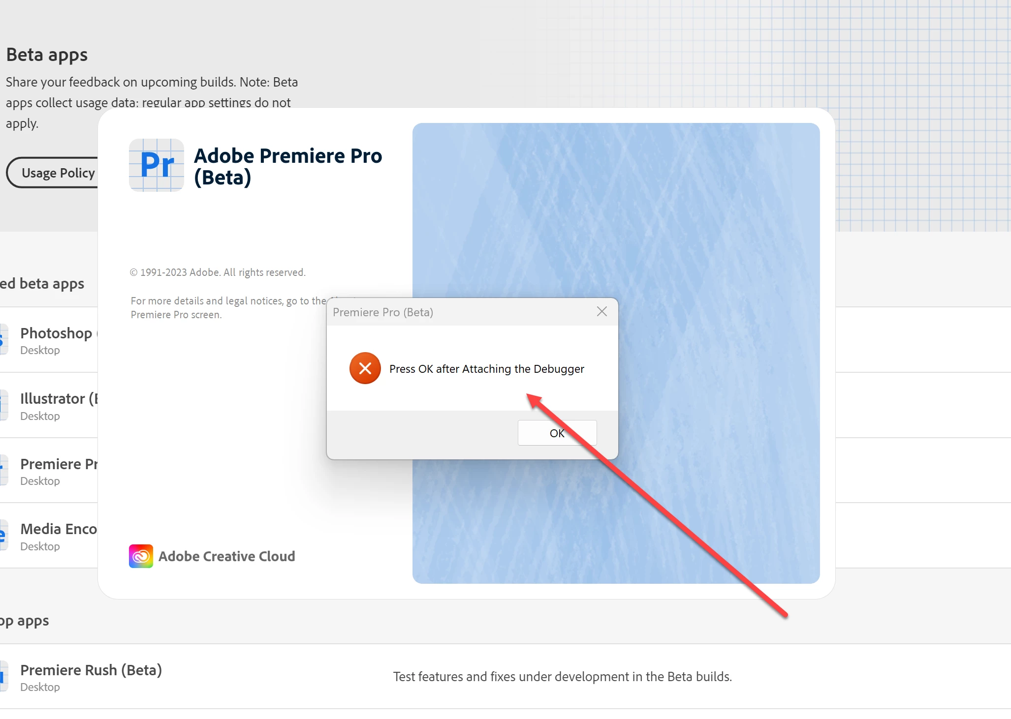 Premiere Pro wont open suddenly and Pro (Beta) says press ok after attaching debugger?