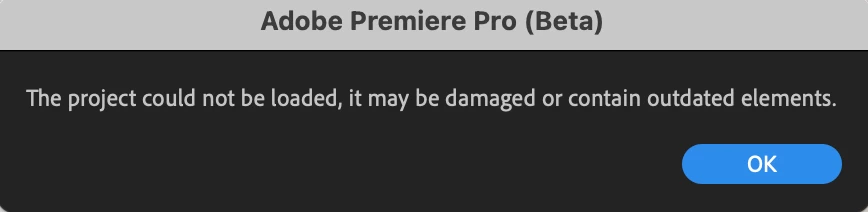 I've been working on a project for like 5 days, it is a 2 hours and 30 minutes full course, on Adobe Premiere Pro Beta. When I opened Premiere this morning and opening the project, a message popped up saying " The Project could not be loaded, it may be damaged or contain outdated elements."