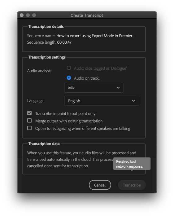 NNoji5C47ParticipantForum|Forum|4 years agoAugust 16, 2021Questiontranscribe AudioForum|Forum|4 years agoAugust 16, 20211 reply150 viewsRECEIVED BAD NETWORK RESPONSE FeedbackError