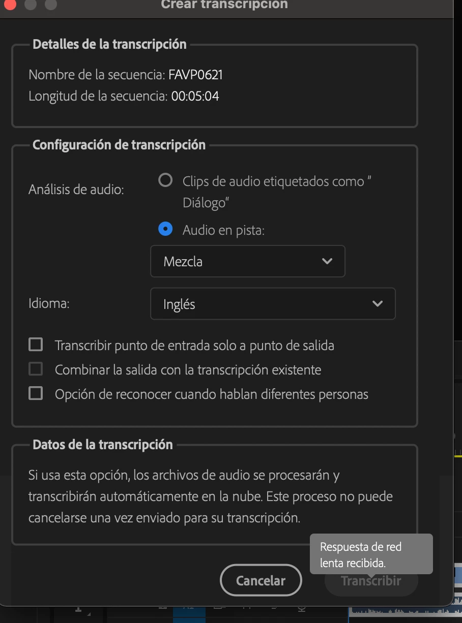 Al intentar transcribir una pista de audio para generar los subtítulos, me aparece el botón TRANSCRIBIR inhabilitado, con la leyenda en hover "Respuesta de red lenta recibida", y no entiendo el tipo de error ni por qué no está funcionando esa característica.