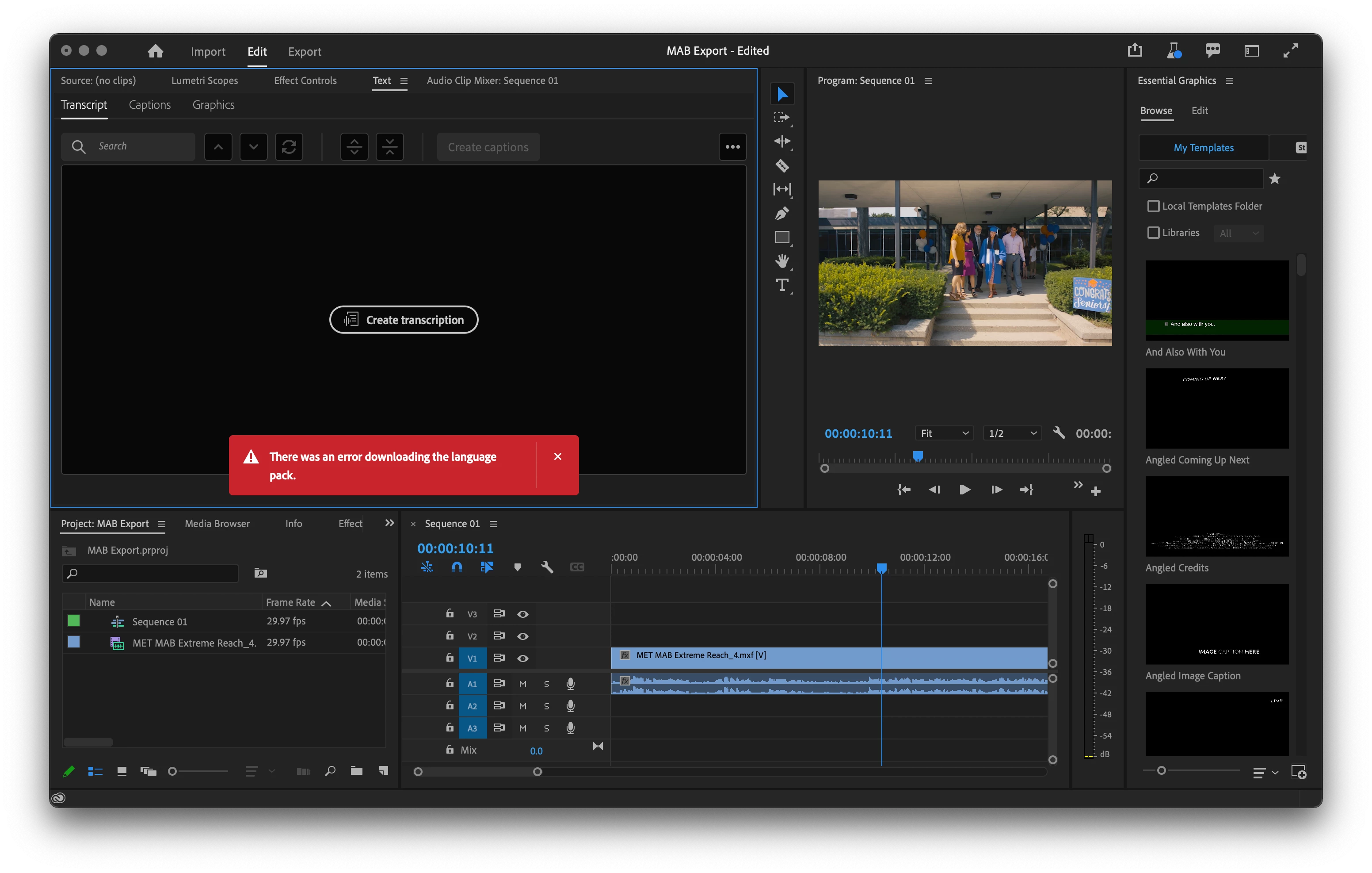 Transcription stopped working in Beta 22. This new version from today, 22.1.1 is still broken for me but now at least I get an error message. It keeps trying to download a language packet - which it never said that before. In previous Beta 22 versions, it would just do nothing after downloading the language pack. Now, it gives an error which I attached. The error message also doesn't go away by clicking the X, so it requires a restart to remove it and continue working.