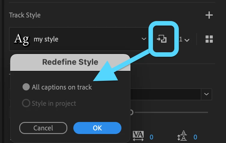Hi, I feel like I didn't fully remember where this feature was before since I haven't used it that much, but there was a way to click on your first caption, make it into a style, and then say, "apply to all captions in this track". Or something like that.