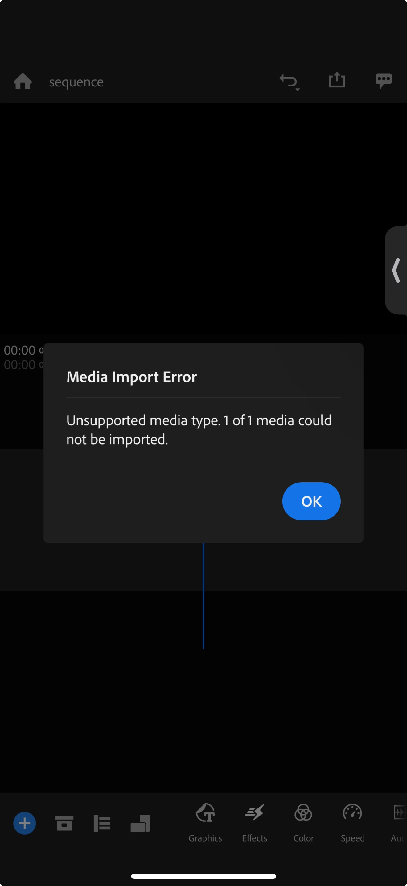 00:00 0 Media Import Error Unsupported media type. 1 of 1 media could not be imported.
