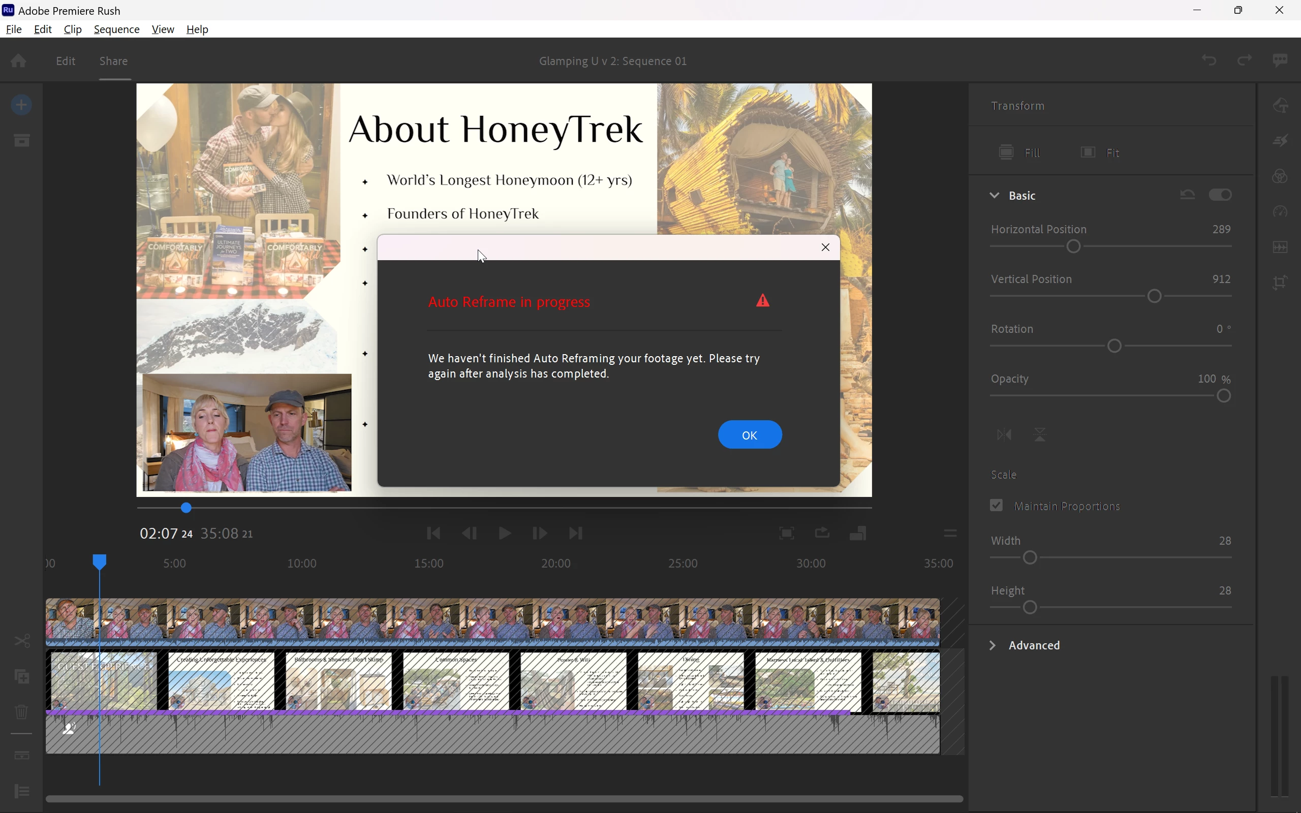 Auto reframe in progress. Won't let me save or export, or stop auto reframe