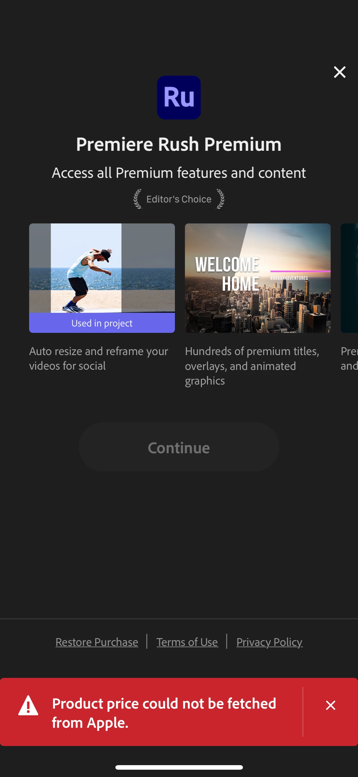 I love the Auto Reframe but can't export using it because whenever I try to upgrade to Premium, I get this message and there is no way to Continue. After pressing x on the notification, the Continue button is still grayed out and cannot be clicked on.