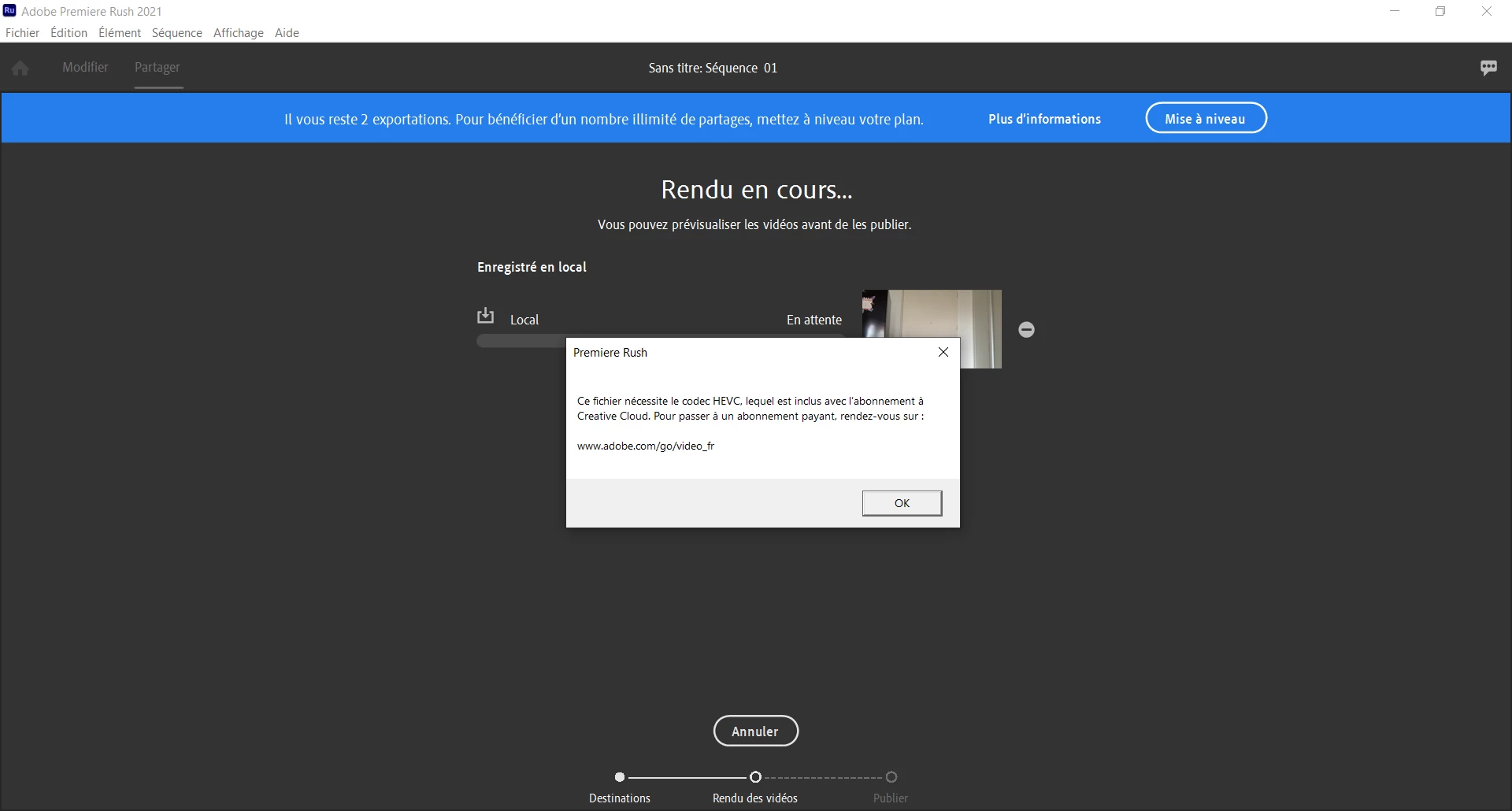 Bonjour, au moment exporter ma vidéo j'ai un message qui s'affiche et qui expêche l'exportation de la vidéo sur mon PC. J'ai la version d'essai de Premiere Rush et il me reste pourtant 2 exportations possibles, pouvez-vous m'aider ? Merci !