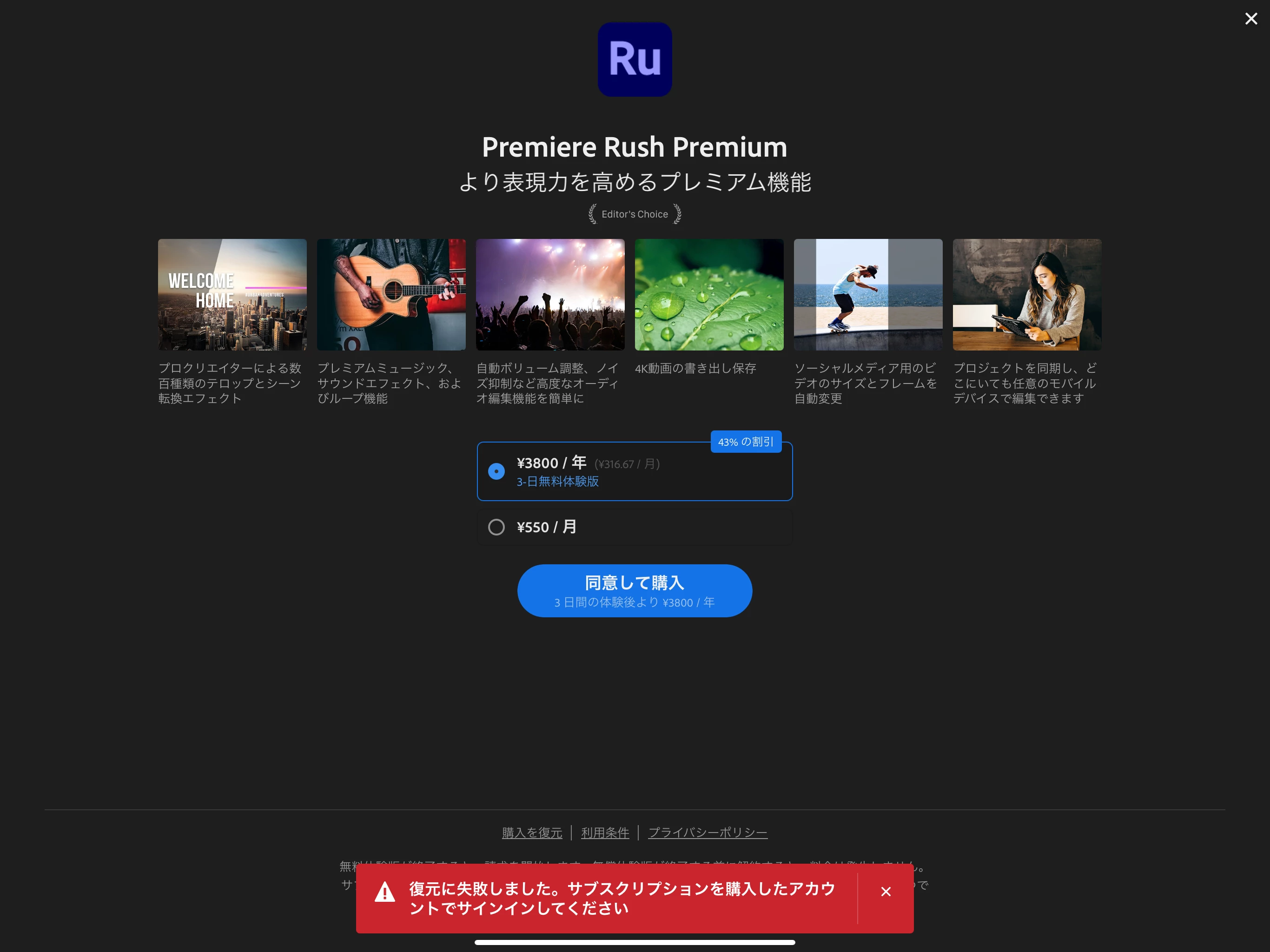 「購入を復元」をクリックすると、「復元に失敗しました」と出ます。