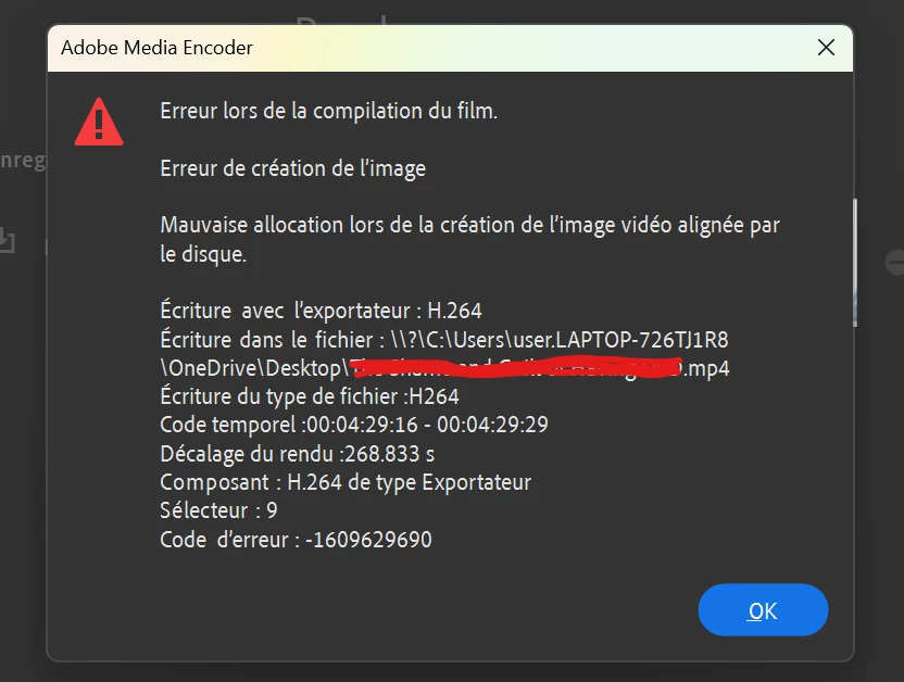 Bonjour, j'ai créé une vidéo plus volumineuse que d'habitude et j'ai essayé plusieurs fois de l'enregistrer sur mon bureau, sans succès. Je reçois toujours le même message d'erreur après quelques minutes, qui affiche "Erreur lors de la compilation du film" et "Erreur de création de l'image" (voir capture d'écran ci-dessous).