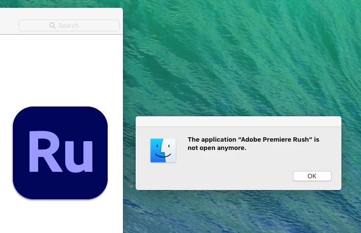 Now on to the actual problem: after I forced quit the program, I try to reopen PR but find that nothing happens, it does not open. So I go into Finder>Applications and do Command>Open but I get the popup saying "The Application Adobe Premier Rush" is not open anymore.