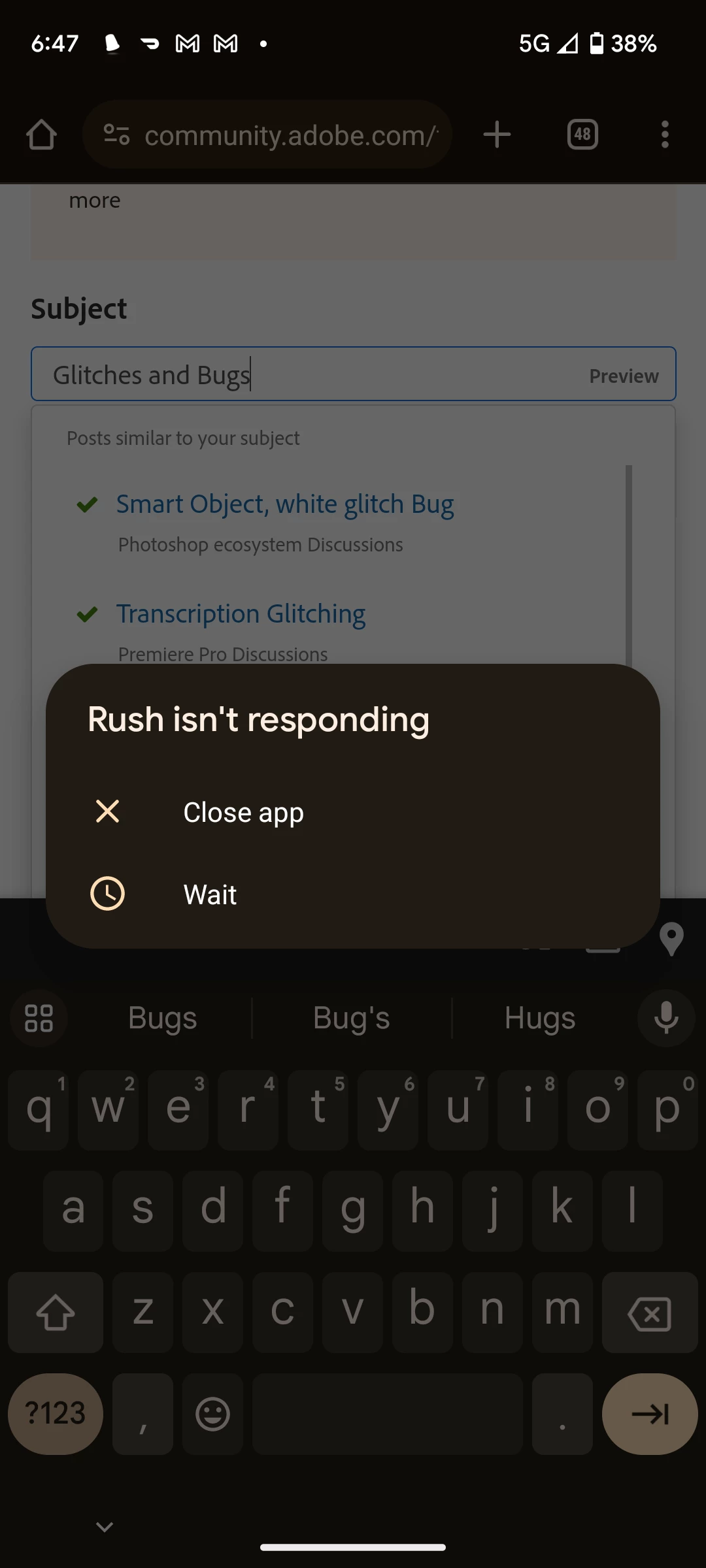 JJimmy33619935tx1vParticipantForum|Forum|2 years agoNovember 15, 2023QuestionGlitches and BugsForum|Forum|2 years agoNovember 15, 20231 reply143 viewsRush constantly freezes and giving the option to giving the option to "Close app" or "Wait" while "Rush is not Responding". Why does this happen so often and how do I make it stop? I edit 4k on the paid subscription. Phone: Pixel 6a.PerformanceFreeze or hangError or problemCrashMobile version