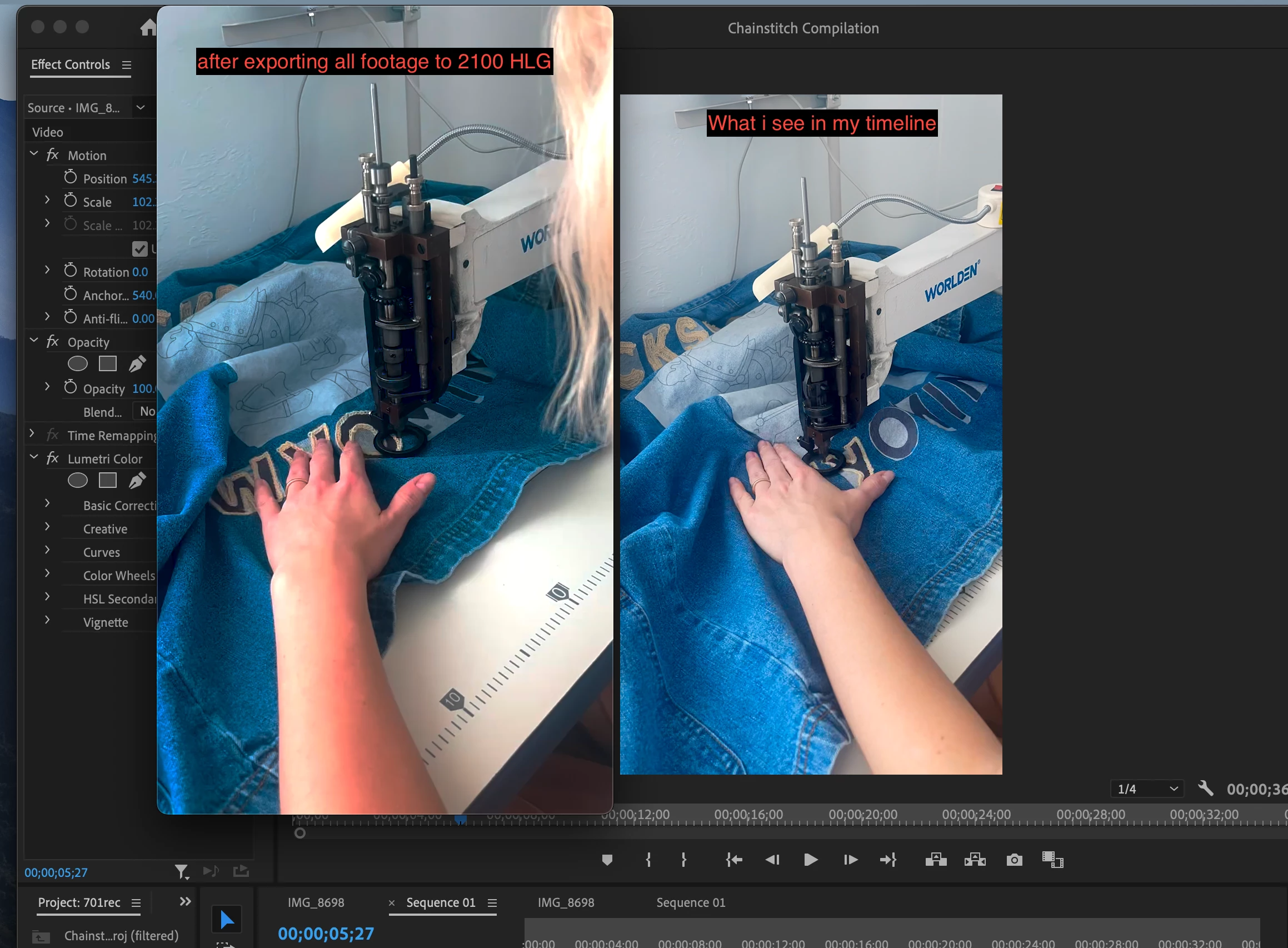 Even after I change all of the videos to footage interpretation Rec 709 and have also tested 2100 HLG and then I match it to the corresponding color working space AND the export color space I still have low contrast desaturated videos with Rec 709 and then way too saturated videos with the 2100 HLG. ON top of all of this frustration even after updating the app I cant airdrop the 2100 HLG file to my phone at least I can do this with the rec 709 file.