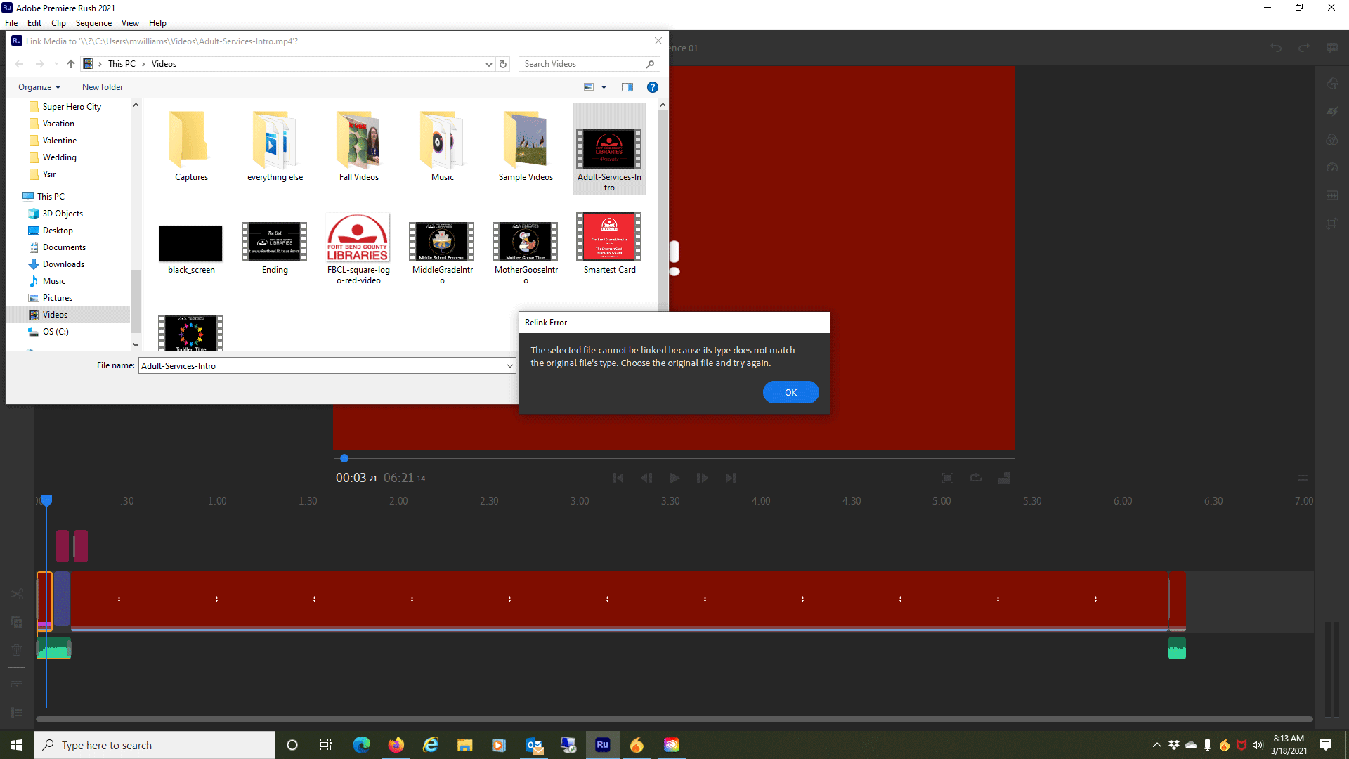 I edited video on 3/12/21 without any hiccup whatsoever. I left work that Friday, locking my computer, and then returned Monday 3/15/21. At some point in the interem time, without anyone else accessing the computer and no restart Adobe Rush has decided that .mp4 files I formerly used as the intro and outro stingers for all my files should become unlinked (similar to if they changed directory).