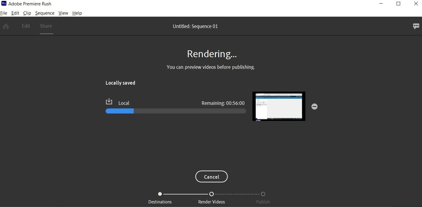 I know it takes a lot to run video editing software but this is ridiculous. After I edited my first sequence, I went to Share > Local Files > to my PC (not to any cloud-related service). Rush then renders, which for a 45:00 sequence took about 1:12:00 to render. When I click Export, it starts rendering again, ad infinitum.